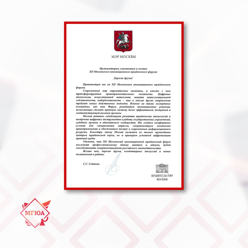 В адрес XII Московского инновационного юридического форума поступил приветственный адрес от мэра Москвы Сергея Собянина.