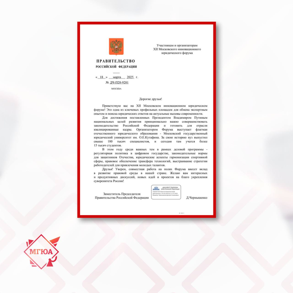В адрес XII Московского инновационного юридического форума поступил приветственный адрес от заместителя председателя Правительства Российской Федерации Дмитрия Чернышенко.